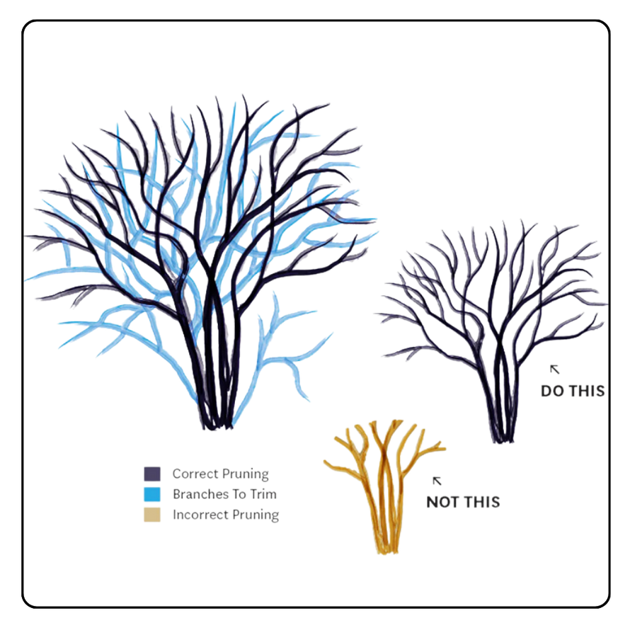 Medium and Standard crape myrtles are normally used for providing shade. Very little pruning is required. Simply remove lower branches to expose the trunk(s) and give them a nice vase shape. Interior branches (see diagrams above) can be removed if possible.